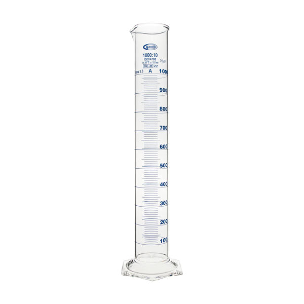 Il cilindro graduato è realizzato con vetro borosilicato 3.3 di qualità superiore, garantendo resistenza chimica, termica e meccanica. Questo materiale è noto per la sua elevata trasparenza e resistenza alle sostanze chimiche, rendendolo ideale per una vasta gamma di applicazioni di laboratorio.