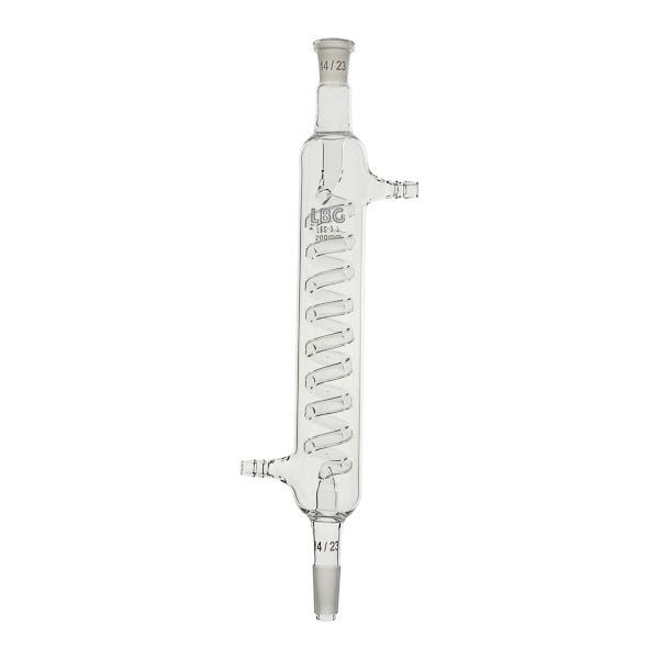 Materiale di Alta Qualità: Costruito in vetro borosilicato LBG 3.3, rinomato per la sua eccellente resistenza agli shock termici e chimici, il refrigerante a serpentina assicura prestazioni affidabili e durature anche nelle condizioni di laboratorio più impegnative.